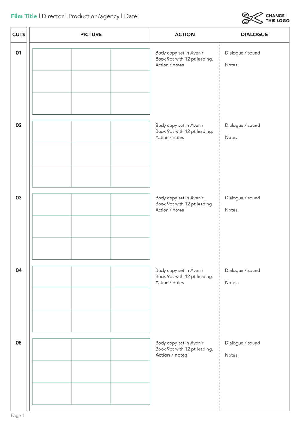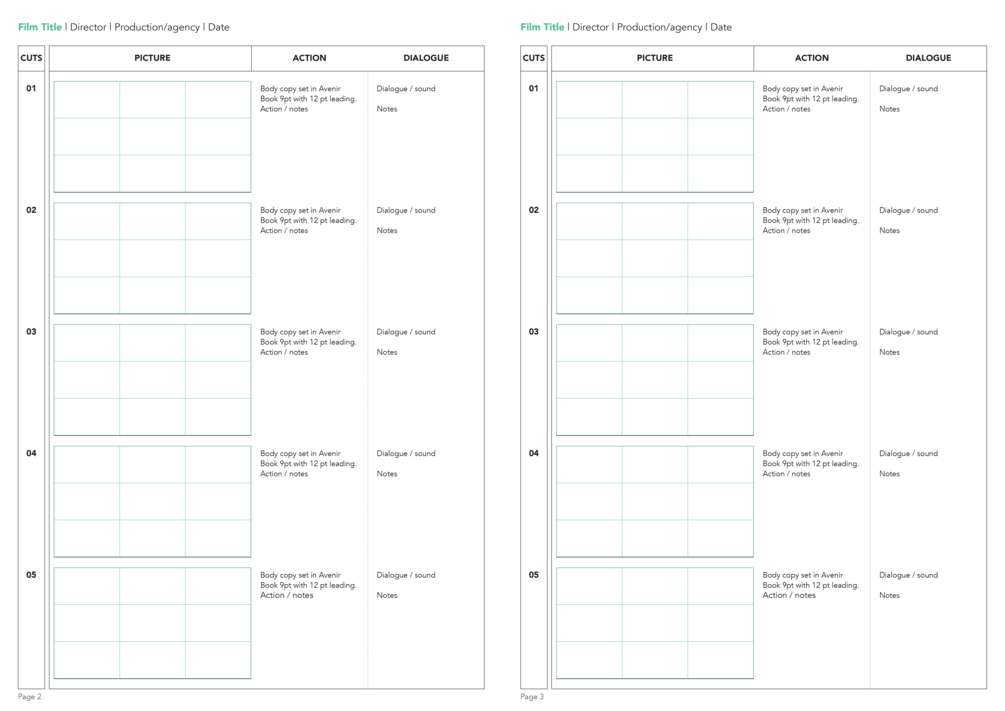 InDesign storyboard template 16:9 (1.77:1) Avenir Book on A4 Vertical with boxes