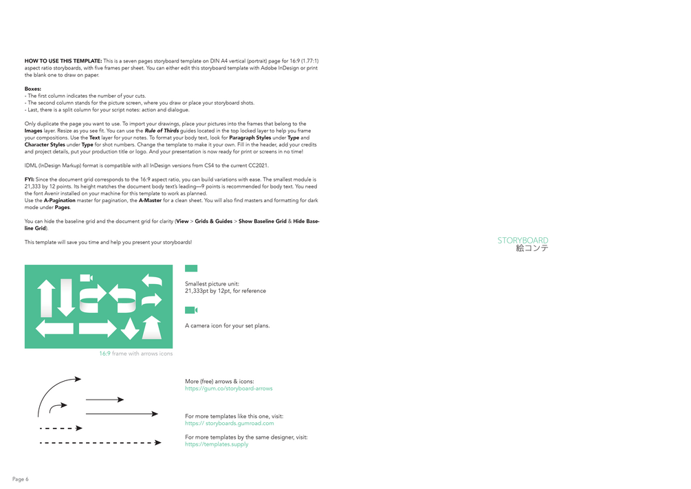 This is a seven pages storyboard template on DIN A4 vertical (portrait) page for 16:9 (1.77:1) aspect ratio storyboards, with five frames per sheet. You can either edit this storyboard template with Adobe InDesign or print the blank one to draw on paper.