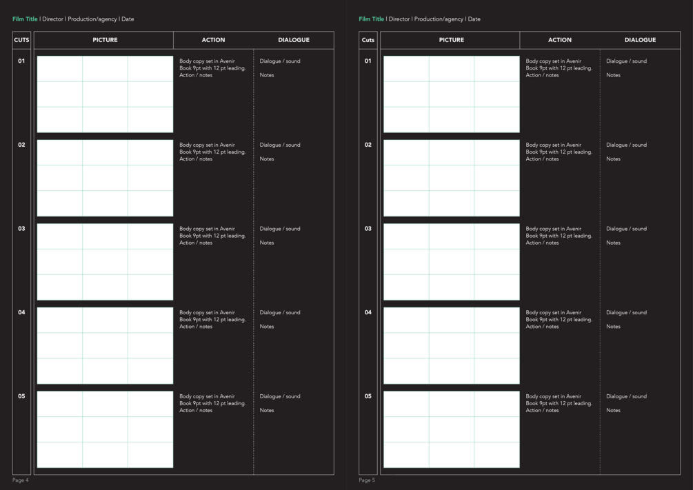 InDesign storyboard template 16:9 (1.77:1) Avenir Book on A4 Vertical with boxes