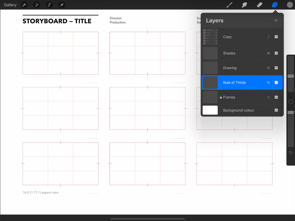 Free Procreate storyboard template on DIN A4 horizontal (landscape) page for story artists, animators, film directors, illustrators, and designers. This template has nine frames per sheet, in 16:9 aspect ratio (1.77:1).
