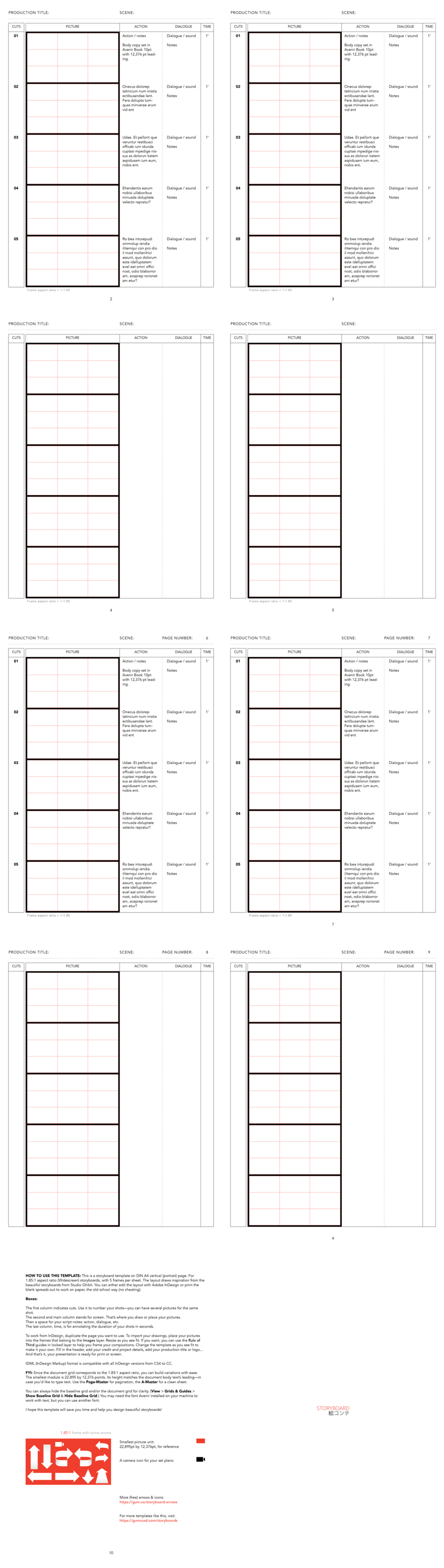 This is a storyboard template on DIN A4 vertical (portrait) page with 5 frames per sheet, for 1.85:1 aspect ratio (Widescreen) films. The layout draws inspiration from the beautiful storyboards from Studio Ghibli. You can either edit the layout with Adobe InDesign or print it out blank to work on paper, the old school way (no cheating).