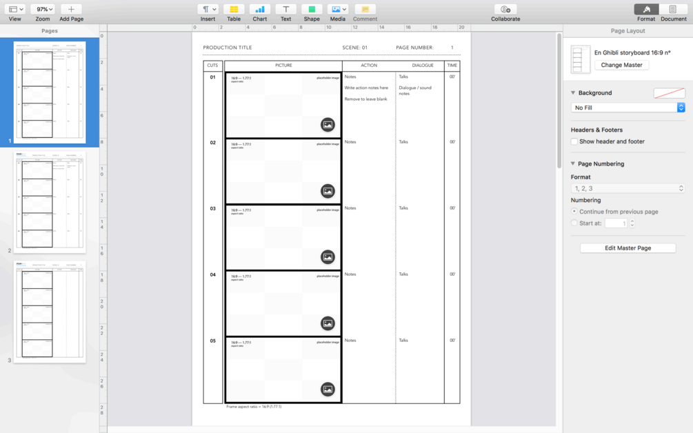 This is an anime storyboard template for DIN A4 vertical (portrait) page ready to use. You can edit this .template file with with Pages, the free Apple productivity app. Designed for anime storyboards, with 5 frames per sheet, each frame sets an exact 16:9 (1.77:1) aspect ratio space for pictures. The layout draws some inspiration from the excellent Studio Ghibli storyboards.