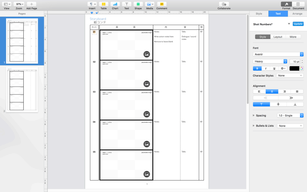 Apple Pages Japanese Anime Storyboard Template for 16:9 aspect ratio on DIN A4 vertical