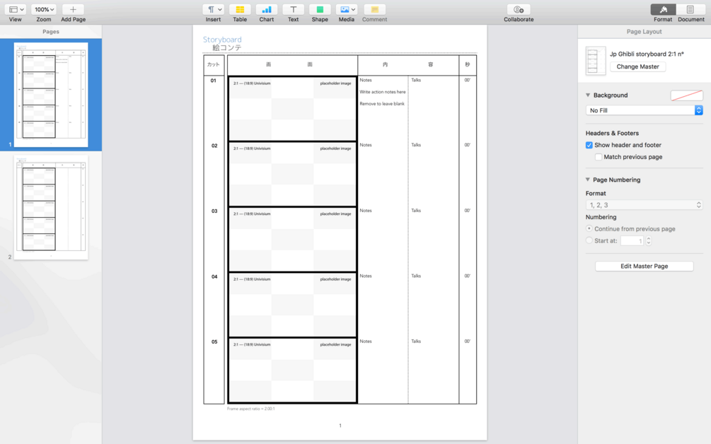 The English version of this template for Pages is available at https://gum.co/Ghibli-storyboard-template_en_2x1_Pages.