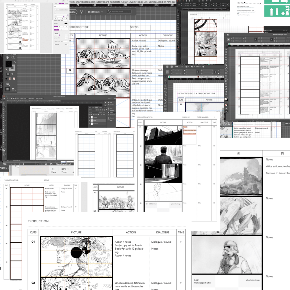 You'll get all the free and paid anime storyboard templates available in 2.39:1, 2.0:1, 1.85:1, 16:9 ratio, in InDesign, Apple Pages, Procreate, and PDF formats.