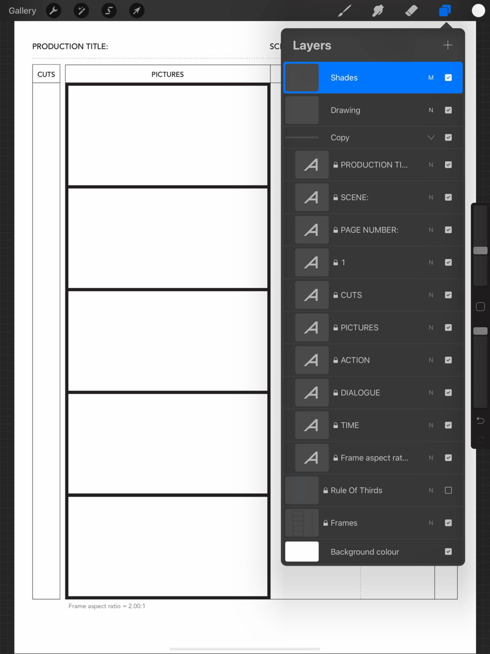 - The second column is the picture screen. That’s where you draw your storyboard shots.