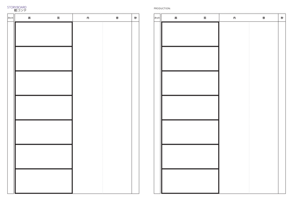 Here is a free anime storyboard template in PDF format on DIN A4 vertical (portrait) page, ready for print. This template comes in two pages with seven frames per sheet, each in scope (2.39.1 ) aspect ratio. The first page has a custom storyboard logo, the second lets you write your production details. This template's layout draws inspiration from the exceptional storyboards.