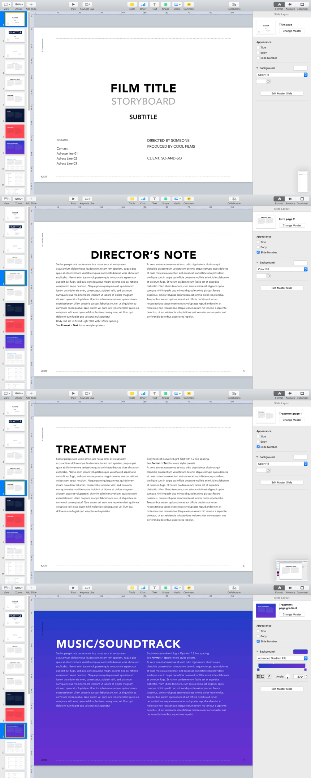 This is a paginated film treatment and storyboard theme for Apple Keynote, ideal to pitch films in 1.85:1 (widescreen) aspect ratio. With over eighty master slides, this theme is ready for print or screen use. The theme has a set of different title pages, intro pages, treatment pages, a text + three frames master, a three frames, notes + set plan + 3 frames, 6 frames numbered, single frame pages and an icon master.