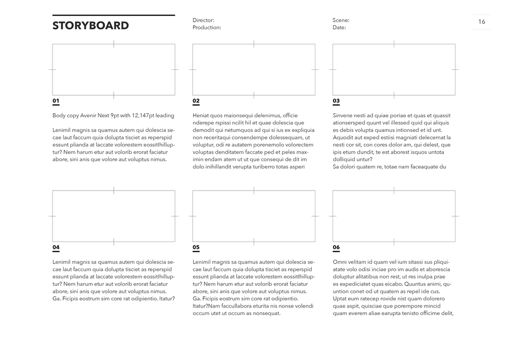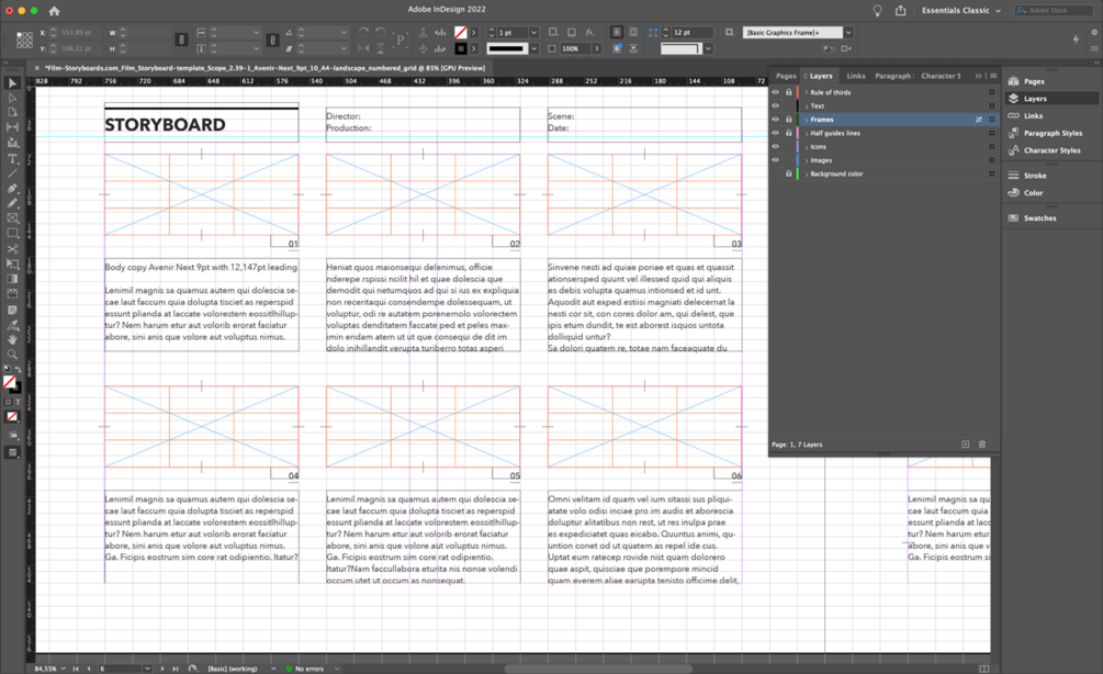 InDesign storyboard template 2.39:1 (Scope) Avenir Next on A4 horizontal