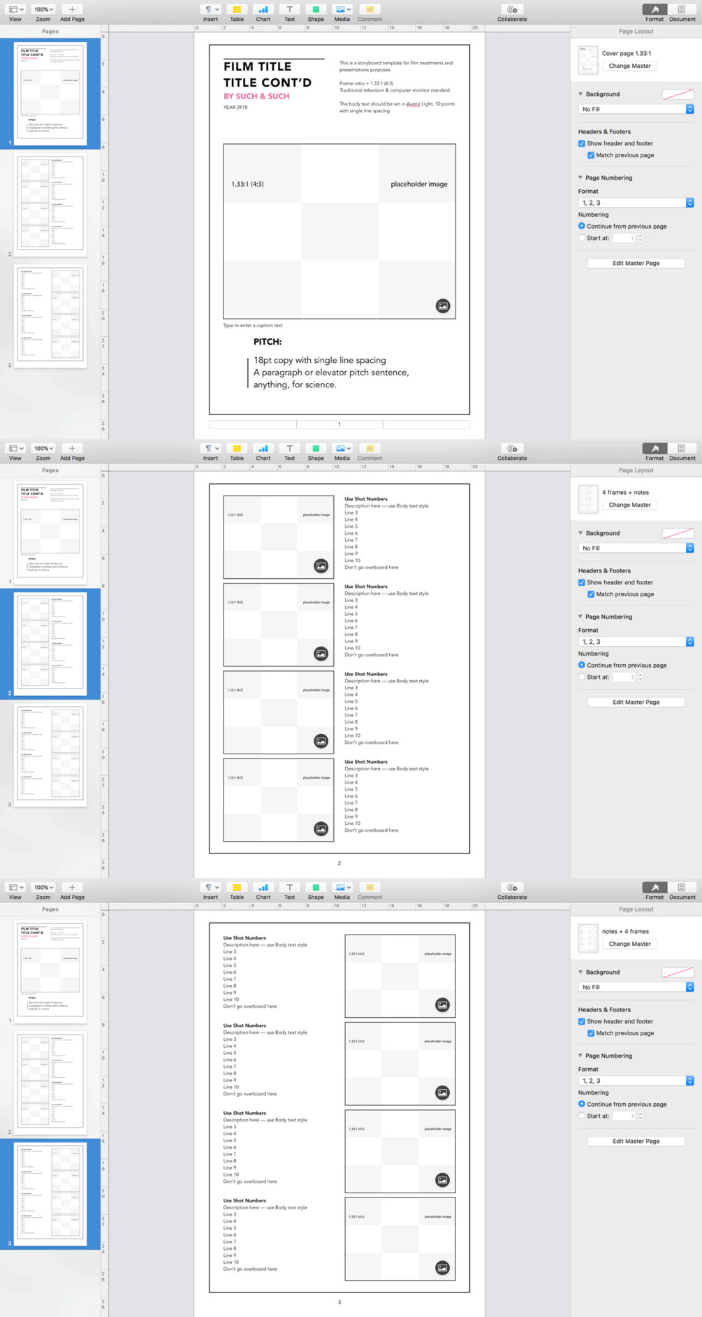 With three master pages to format your layout, this template is perfect to design quick storyboard layouts.