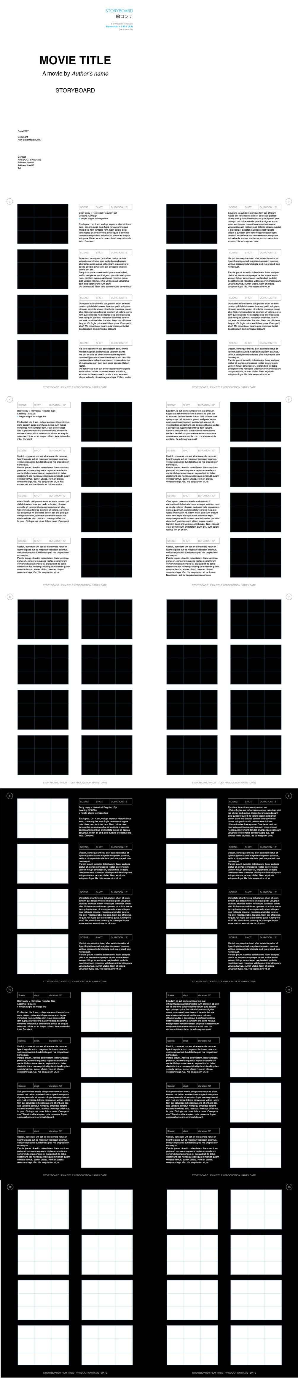 This is a paginated storyboard layout template for Adobe InDesign. The InDesign Markup IDML format is compatible with all InDesign versions since CS4 up to the current Creative Cloud InDesign 2024. The frame ratio is 1.33:1 (4:3), an older television & computer monitor standard.