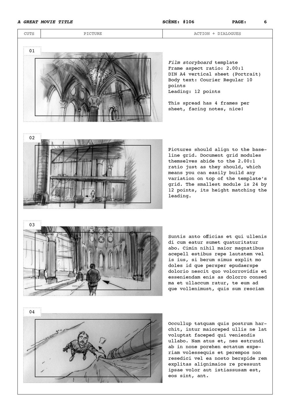 You can always hide the baseline grid and/or the document grid for clarity. (View > Grids & Guides > Show Baseline Grid & Hide Baseline Grid). You need the Courier font installed on your machine to use this template to the fullest. You can also print the blank template when you need to draw storyboards in clean frames on paper.