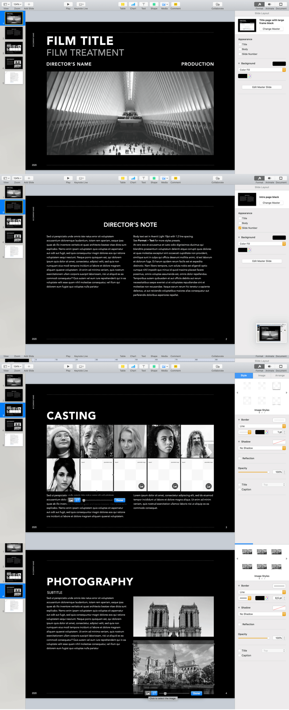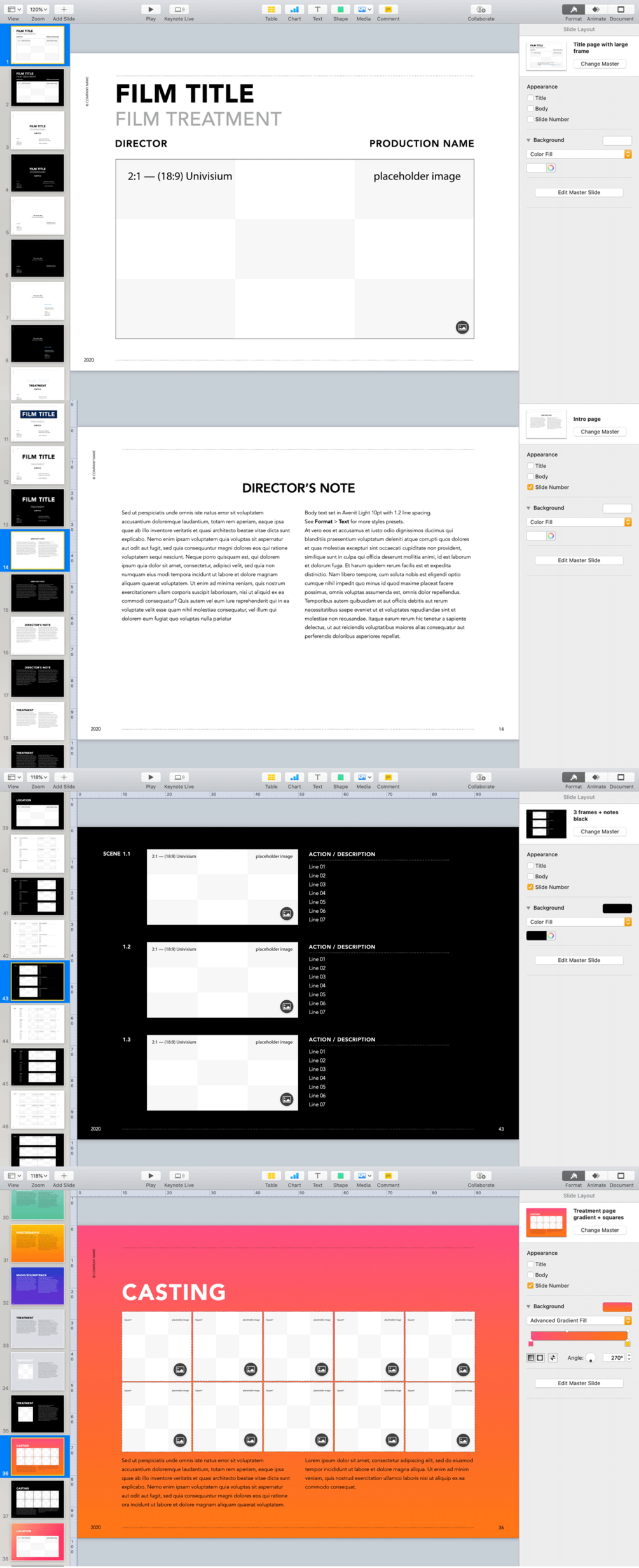 Film directors and producers like to use this paginated film treatment and storyboard theme for Apple Keynote, perfect to pitch 2.00:1 aspect ratio films. (Univisium is cinematographer Vittorio Storaro format). With over sixty master slides, this theme is ready for print and screen use. This theme has a set of different title pages, intro pages, treatment pages, many options for treatment and storyboards layout, a light and a dark mode, and an icon master.