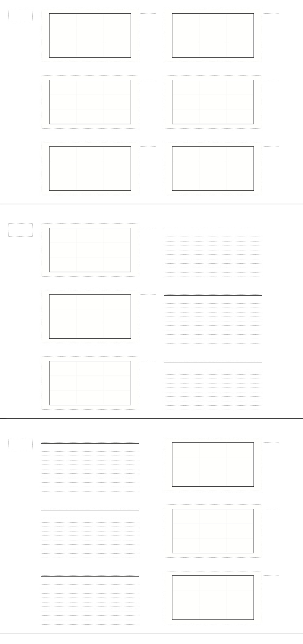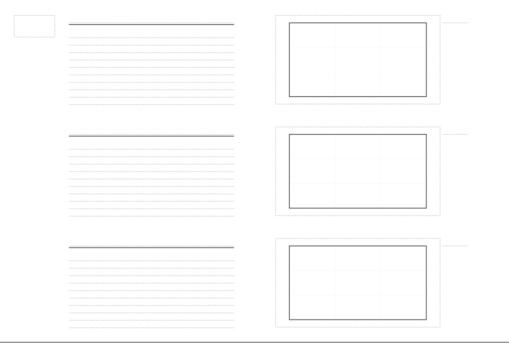 Three pages on DIN A4 landscape; the first has 6 blank frames in two columns, three rows. The second has 3 frames in a row, facing dotted lines for text; last with dotted lines facing 3 frames in a row.